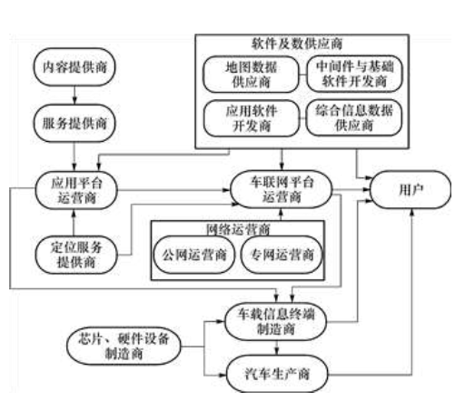 主要包括地圖數(shù)據(jù)、綜合信息數(shù)據(jù)、中間件及基礎軟件和應用軟件開發(fā)等4 個子環(huán)節(jié)。地圖數(shù)據(jù)。地圖提供商為車聯(lián)網(wǎng)服務提供專用的電子地圖。專用電子地圖不但記錄各條道路自身的位置信息,還考慮了各條道路之間的相互關系、拓撲結(jié)構(gòu)等。我國業(yè)內(nèi)通用做法是自行制造地理信息系統(tǒng)引擎和電子地圖。我國目前有11 家甲級測繪資質(zhì)的導航電子地圖單位可制作全國導航電子地圖,企業(yè)化運作的有7 家。綜合信息數(shù)據(jù)。綜合信息數(shù)據(jù)環(huán)節(jié)包括深度興趣點數(shù)據(jù)、動態(tài)交通信息數(shù)據(jù)等細分產(chǎn)業(yè)鏈環(huán)節(jié)。中間件及基礎軟件。中間件是國家信息化建設的核心基礎軟件,目前國內(nèi)中間件企業(yè)己經(jīng)掌握了部分核心技術,能夠部分提供運營體系的基礎設施以及相關的軟件架構(gòu)體系。地理信息系統(tǒng)引擎是車聯(lián)網(wǎng)位置服務中經(jīng)常用到的中間件或基礎軟件,可以放置在單獨服務器上為平臺運營商實現(xiàn)地理信息與地理位置之間的轉(zhuǎn)化,也可以內(nèi)置在導航儀中為個人用戶提供服務。應用軟件開發(fā)。應用軟件是車聯(lián)網(wǎng)產(chǎn)業(yè)鏈上市場空間比較大的部分,這一環(huán)節(jié)和IT 渠道的關系最為緊密。